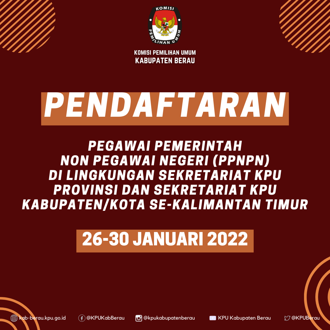 Melalui Surat Pengumuman Nomor 1/SDM.02.1/64/2022 tentang Lowongan Pendaftaran Pegawai Pemerintah Non Pegawai Negeri (PPNPN) Sekretariat Jenderal KPU RI, Sekretariat KPU Provinsi/ KIP Kabupaten/Kota, KPU Provinsi Kalimantan Timur memberikan kesempatan kepada putra-putri terbaik bangsa untuk menjadi Pegawai Pemerintah Non Pegawai Negeri (PPNPN) Tahun Anggaran 2022 pada lingkungan Sekretariat KPU Provinsi dan Sekretariat KPU Kabupaten/Kota Se-Kalimantan Timur. Info selengkapnya silahkan klik link dibawah. Pengumuman Pendaftaran Pegawai Pemerintah Non Pegawai Negeri (PPNPN) ....