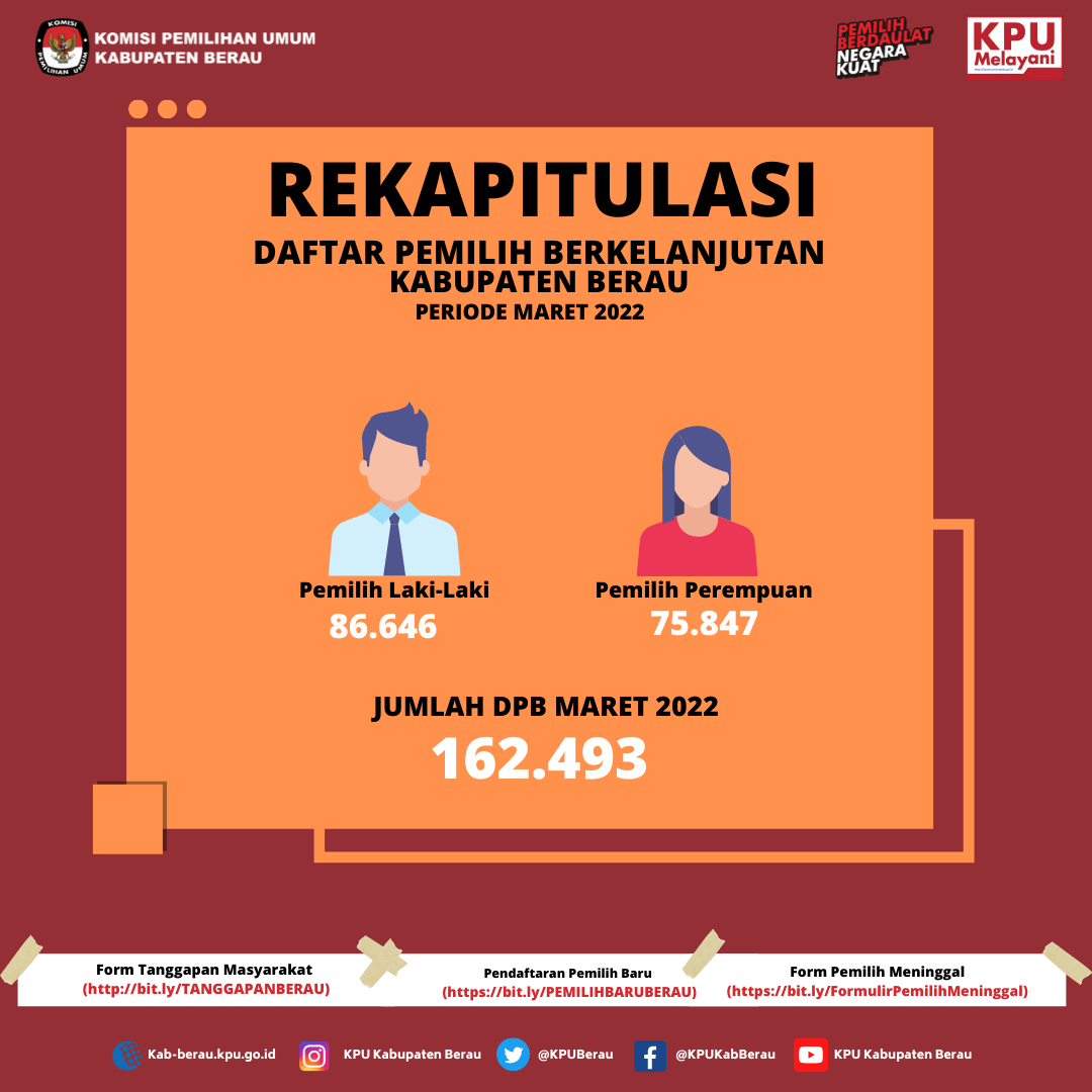 Hai#TemanPemilih, Berikut Rekapitulasi Daftar Pemilih Berkelanjutan Kabupaten Berau Bulan Maret 2022 Silahkan check data diri melalui Halaman (https://lindungihakmu.kpu.go.id/), atau langsung datang ke Kantor KPU Berau Jl. H.Isa 1 (Gedung BPBD Lantai 1), Kelurahan Bugis, Tanjung Redeb Berikan tanggapan masyarakat dan daftarkan diri melalui - Link : Form Tanggapan Masyarakat (http://bit.ly/TANGGAPANBERAU) - Link : Pendaftaran Pemilih Baru (https://bit.ly/PEMILIHBARUBERAU ) - Link : Form Pemilih Meninggal (https://bit.ly/FormulirPemilihMeninggal) Terhadap masyarakat Berau : 1. Belum terdaftar sebagai pemilih 2. Tidak Memenuhi Syarat 3. Mengalami perubahan elemen data....
