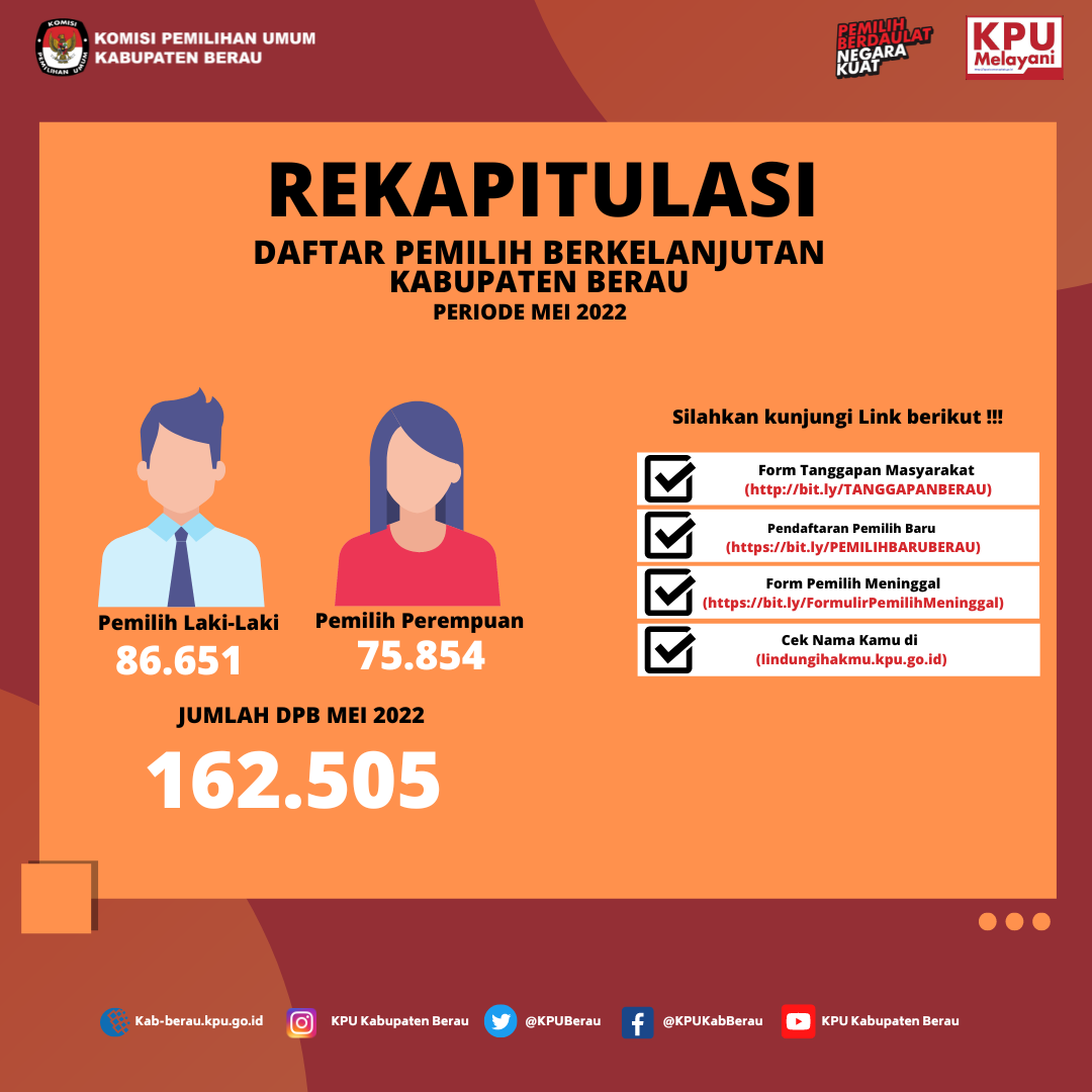 Hai#TemanPemilih, Berikut Rekapitulasi Daftar Pemilih Berkelanjutan Kabupaten Berau Bulan Mei 2022 Silahkan check data diri melalui Halaman (https://lindungihakmu.kpu.go.id/), Website KPU Kabupaten Berau http://kab-berau.kpu.go.id atau langsung datang ke Kantor KPU Berau Jl. H.Isa 1 (Gedung BPBD Lantai 1), Kelurahan Bugis, Tanjung Redeb Berikan tanggapan masyarakat dan daftarkan diri melalui - Link : Form Tanggapan Masyarakat (http://bit.ly/TANGGAPANBERAU) - Link : Pendaftaran Pemilih Baru (https://bit.ly/PEMILIHBARUBERAU ) - Link : Form Pemilih Meninggal (https://bit.ly/FormulirPemilihMeninggal) Terhadap masyarakat Berau : 1. Belum terdaftar sebagai pemilih 2. Tidak Memenuhi Syarat 3. Mengalami perubahan elemen data ....