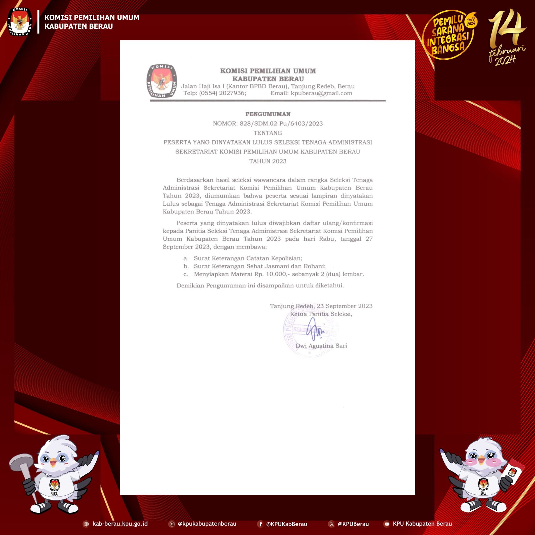 Halo #TemanPemilih, berikut adalah Pengumuman peserta yang dinyatakan lulus Seleksi Administrasi Tenaga Administrasi Sekretariat Komisi Pemilihan Umum Kabupaten Berau Tahun 2023,