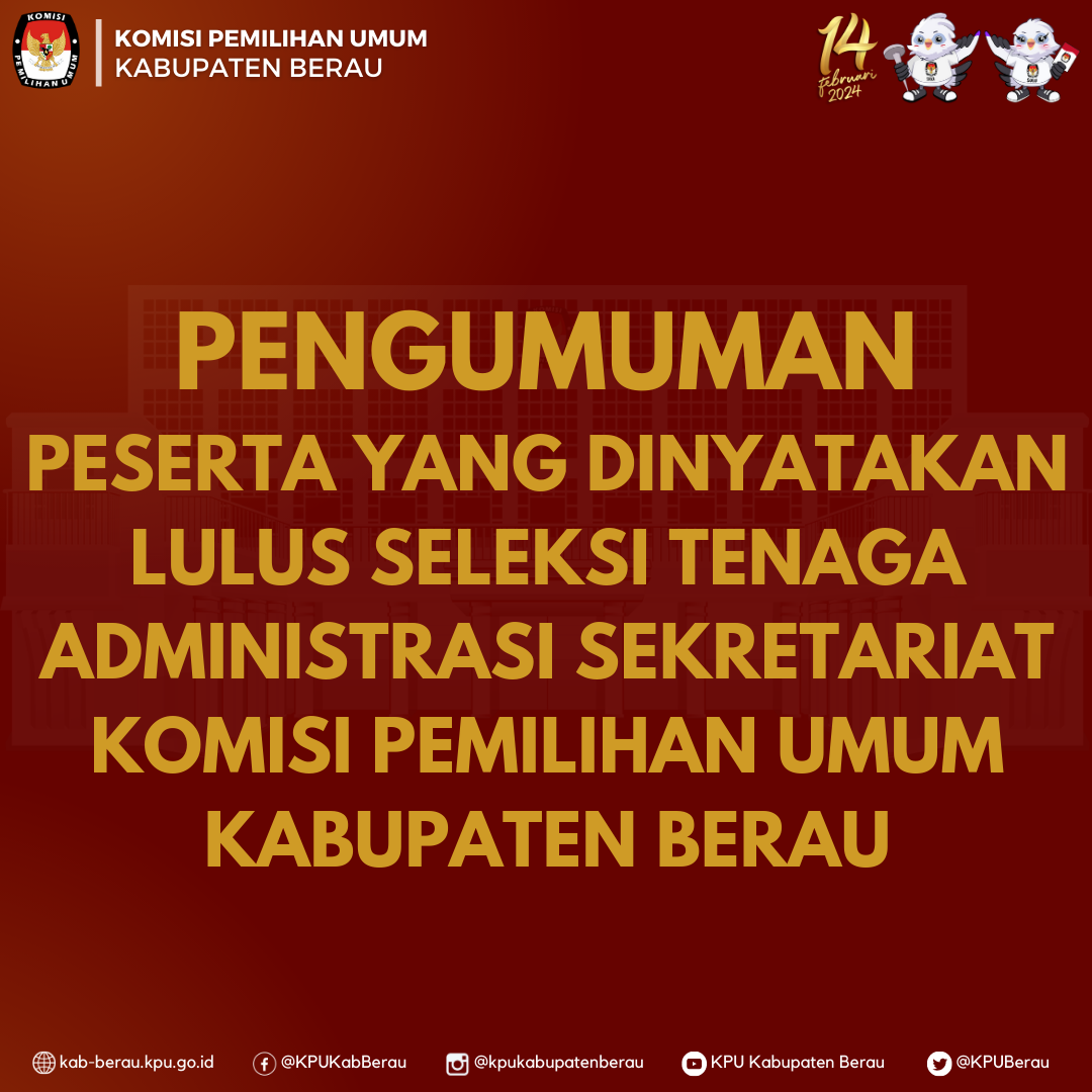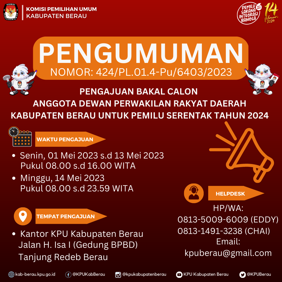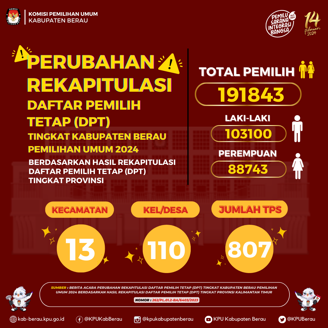 Hai #TemanPemilih, Pada hari Rabu tanggal Dua Puluh Delapan bulan Juni tahun Dua Ribu Dua Puluh Tiga bertempat di Kantor KPU Kabupaten Berau, KPU Kabupaten Berau telah melaksanakan Rapat Pleno Perubahan Rekapitulasi Daftar Pemilih Tetap (DPT) Tingkat Kabupaten Berau untuk Pemilihan Umum Tahun 2O24 Berdasarkan Hasil Rekapitulasi Daftar Pemilih Tetap (DPT) Tingkat Provinsi Kalimantan Timur.